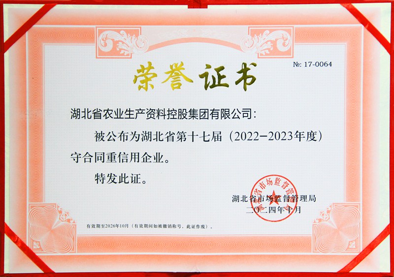 近日,湖北省市場監(jiān)督管理局公布省第十七屆(2022—2023年度)“守合同重信用”企業(yè)名單,農資控股集團連續(xù)第十屆入選榜單,再獲殊榮。
